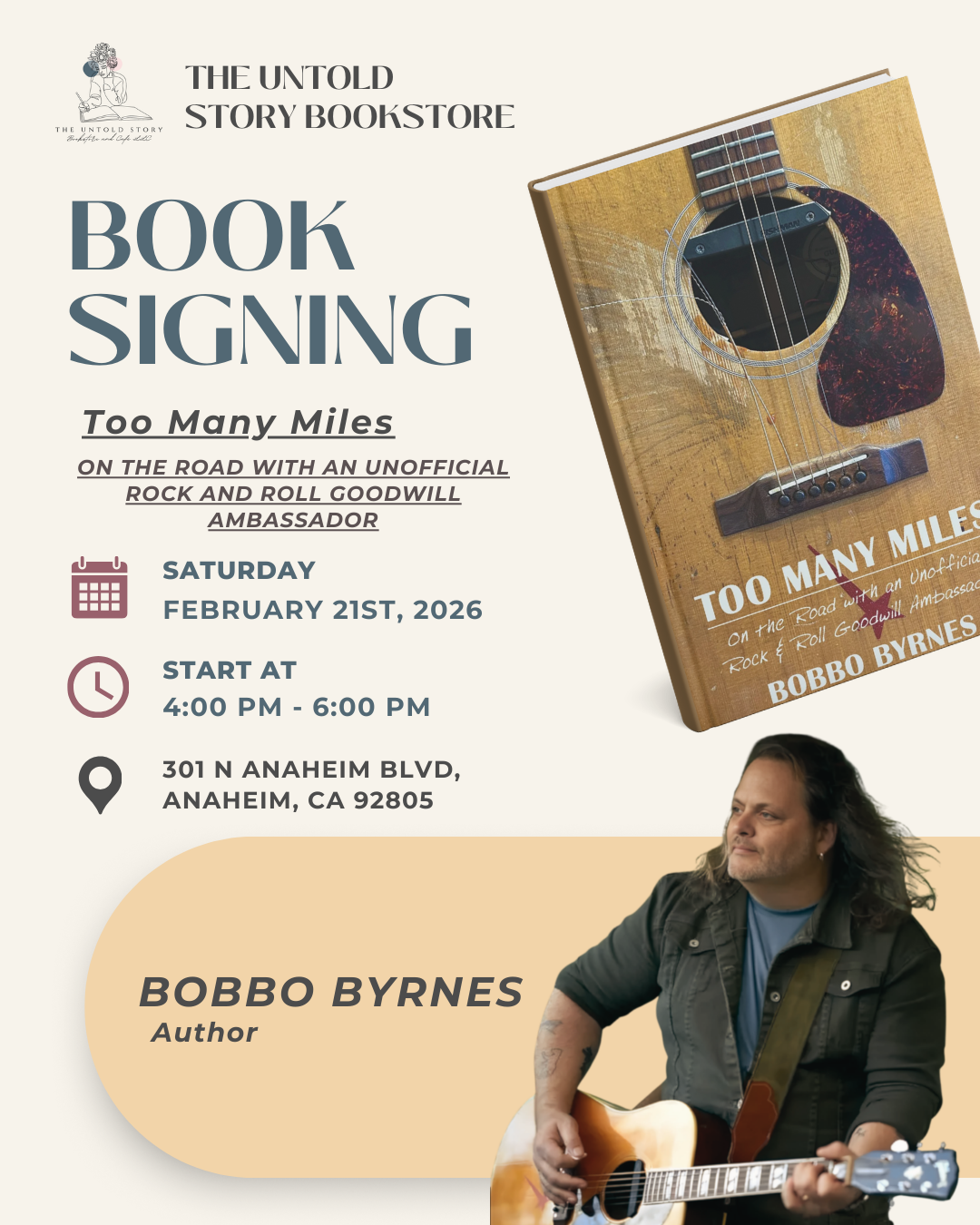 Join us Saturday, February 21st, at 4:00 pm for a book signing with Bobbo Byrnes and their book Too Many Miles!📚🎵